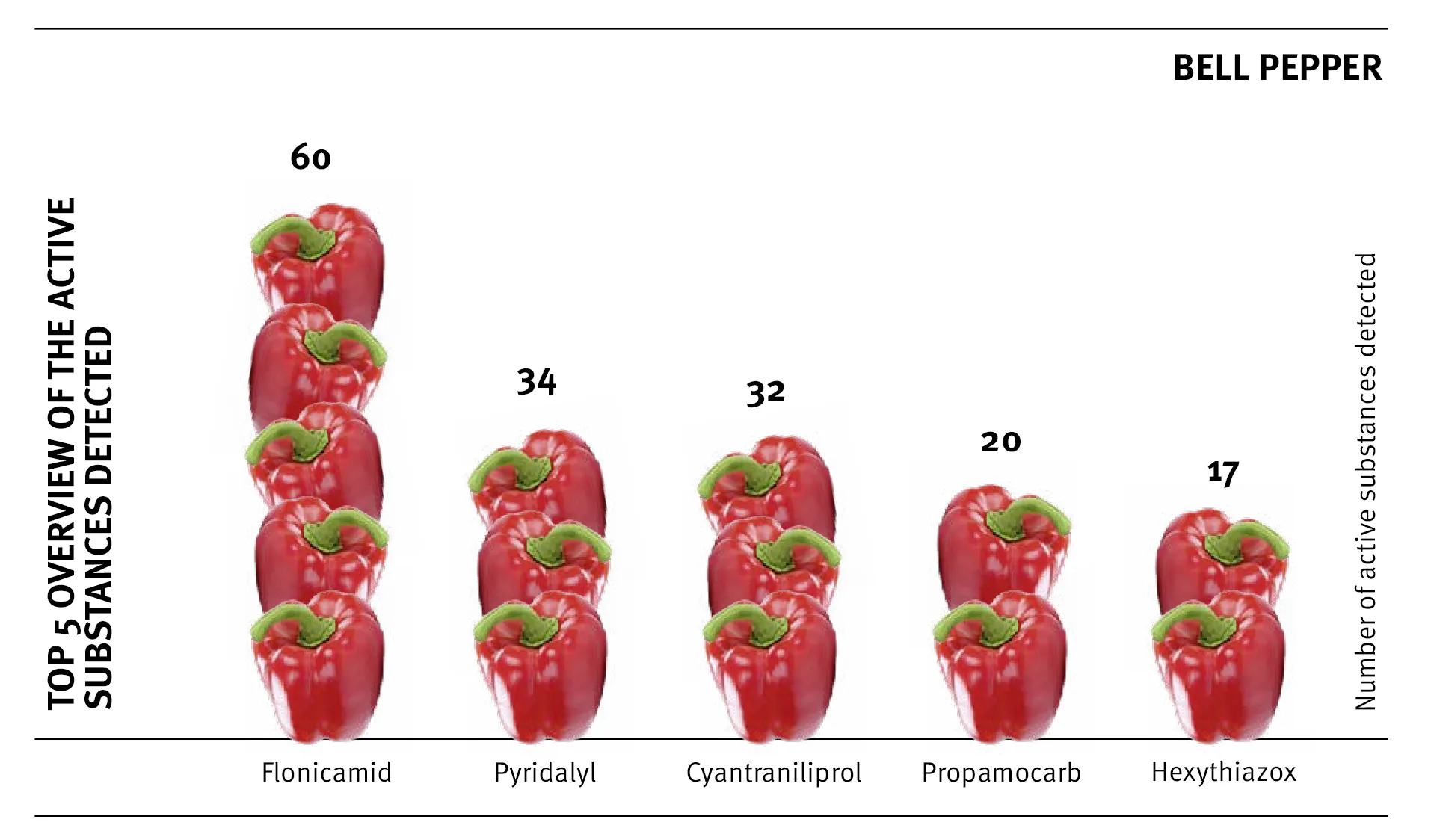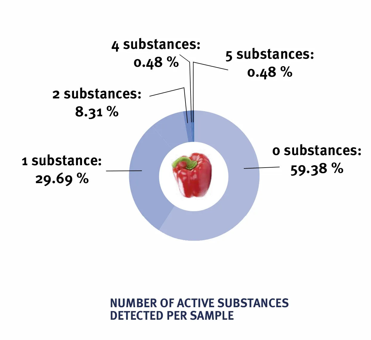 Gemüsepaprika: Anteil der nachgewiesenen Wirkstoffe pro Probe