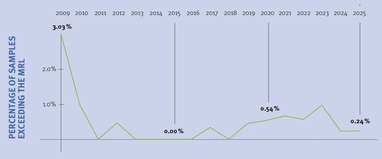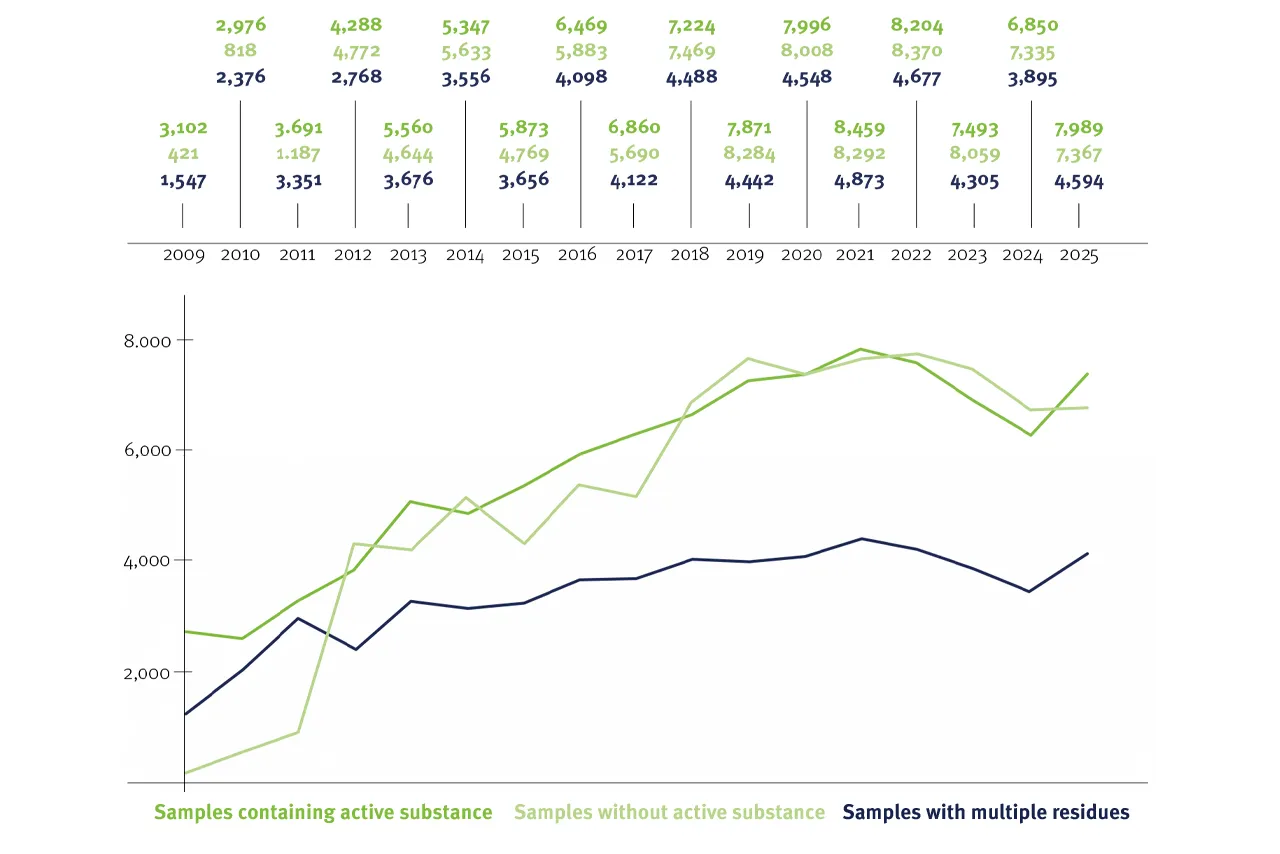 Zwischen 2009 und 2025 ist die Anzahl der Proben, in denen keine Pflanzenschutzmittel-Wirkstoe, jeweils ein Wirksto oder mehrere unterschiedliche Wirkstoffe von Pflanzenschutzmitteln nachgewiesen wurden, kontinuierlich angestiegen. Im Verhältnis zum Anstieg der Gesamtprobenzahl ist über die Anzahl der Proben mit Mehrfachrückstände konstant geblieben und die Anzahl der Proben ohne Rückstände oder mit nur einem Wirkstoff-Rückstand gestiegen, was für eine steigende Qualität der Ware spricht.