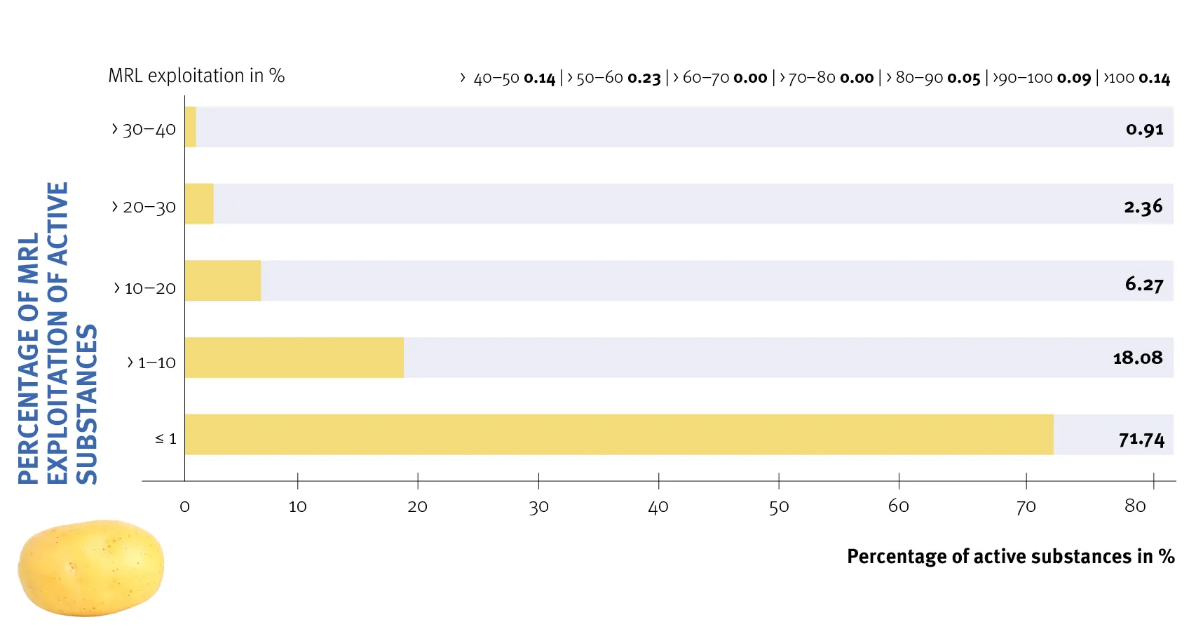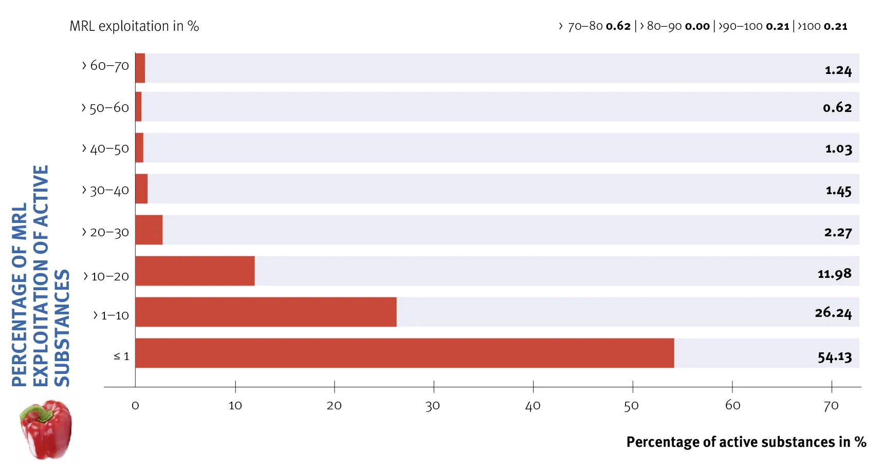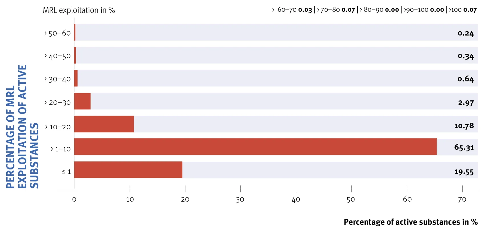 Die Auslastung der Rückstandshöchstgehalte lag bei 95,6 % der gefundenen Wirkstoffe bei maximal 20 % (s. Grafik)