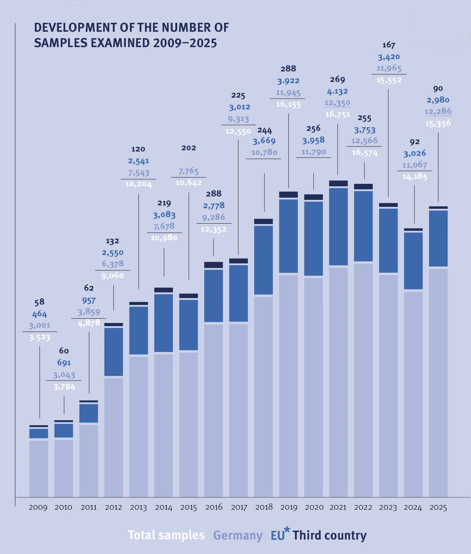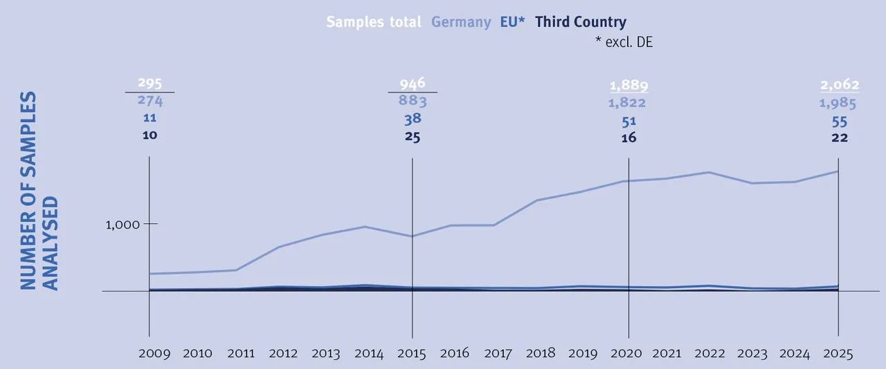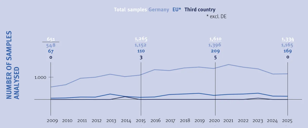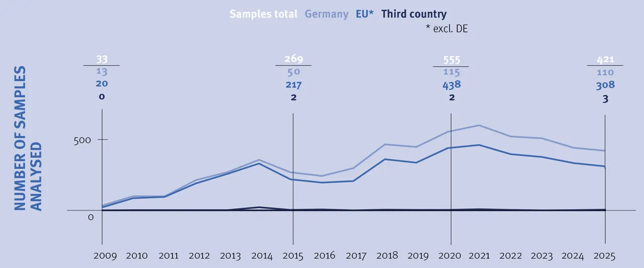 In der Summe stammte der Großteil der zwischen 2009 und 2025 untersuchten Proben aus Deutschland (152.615 Proben), gefolgt von 47.611 Proben aus der EU sowie 3.027 Proben aus Drittländern außerhalb der EU.