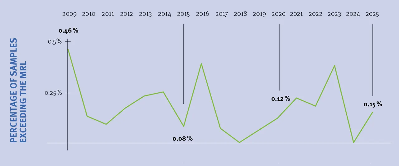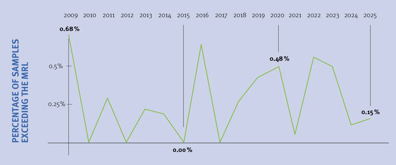 - Überschreitungsquote für Produkte aus Deutschland: 0,67 % (Zum Vergleich: 0,44 % (2024) /0,66 % (2023) / 0,64 % (2022) / 0,45 % (2021))