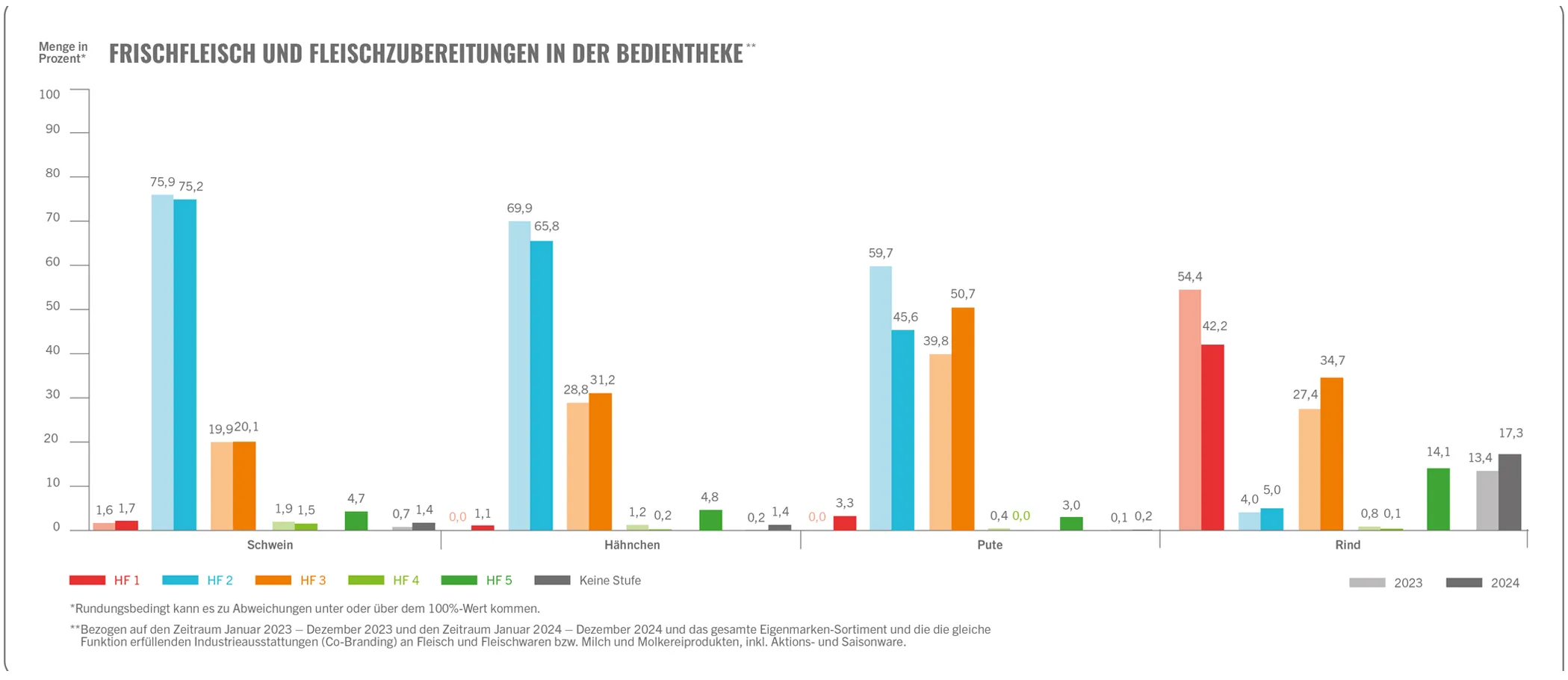 Die Initiative Tierwohl GmbH hat als Trägerin der Haltungsform neue Zahlen zur Haltungsform‑Kennzeichnung vorgelegt, die die Verteilung der fünf Stufen im Jahr 2024 zeigen und den Vergleich zum Vorjahr ermöglichen. Die aktuellen Zahlen machen deutlich, dass sich das Angebot – insbesondere bei Putenfleisch – weiter von Haltungsformstufe 2 hin zu Haltungsformstufe 3 verschiebt (+13,3 %) und damit ein deutlicher Schritt in Richtung höherer Tierwohlstandards erfolgt. Gleichzeitig bleibt Haltungsformstufe 2 bei Schweinefleisch auf einem sehr hohen und stabilen Niveau (75,2 % Bedientheke; 86,3 % SB-Regal). Die 2024 neu eingeführte Haltungsformstufe 5 Bio