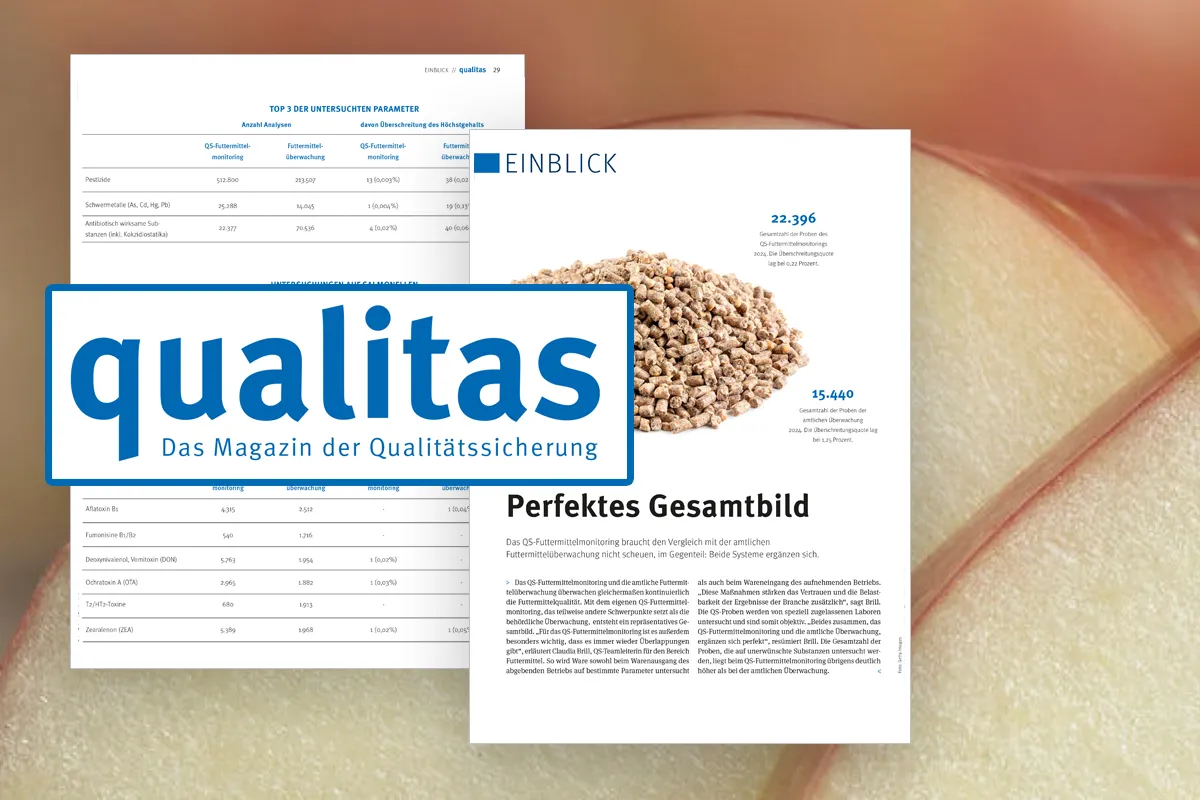 Wie gut funktioniert das Zusammenspiel zwischen dem QS‑Futtermittelmonitoring und der amtlichen Futtermittelüberwachung? Die aktuelle Winter-Ausgabe unseres Magazins qualitas zeigt: Sehr gut! Beide Systeme ergänzen sich nicht nur, sie stärken gemeinsam die Sicherheit und Transparenz entlang der Futterkette.