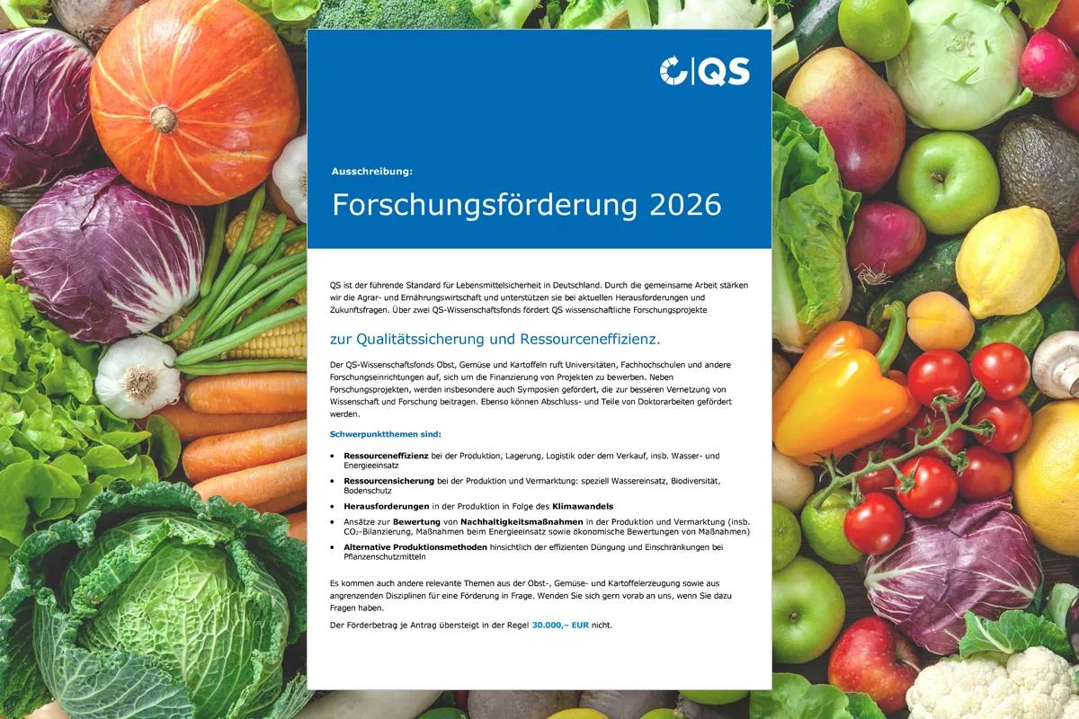 Die aktuelle Ausschreibung des QS-Wissenschaftsfonds Obst Gemüse, Kartoffeln mit sämtlichen relevanten Informationen zur Antragsstellung kann hier angesehen und heruntergeladen werden. Weitere Informationen zu den QS-Wissenschaftsfonds sowie zu den bisher geförderten Projekten finden Sie hier.