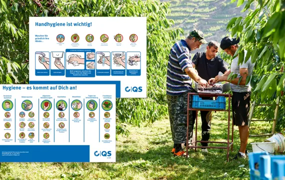 Auf Sauberkeit und Hygiene bei der Ernte liegt ein zentraler Fokus in den QS-Anforderungen für die Erzeugung von Obst und Gemüse. Pünktlich zum Start der Erntesaison hat QS neu gestaltete Infoposter zur Hand- und Arbeitshygieneveröffentlicht, die sich zum Aushang für Arbeitskräfte und Besucher eignen.