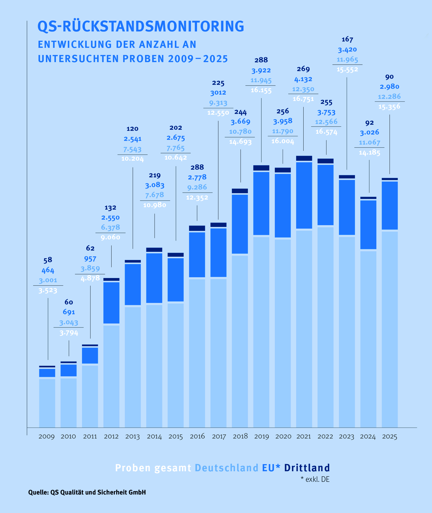 Zwischen 2009 und 2025 stieg die Anzahl der für das QS-Rückstandsmonitoring untersuchten Proben deutlich: Von 3.523 in 2009 auf 15.356 Proben in 2025.