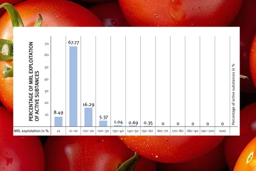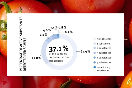 Of the 917 tomato samples, 363 came from Germany, 280 from the Netherlands and 263 from Belgium. None of the samples exceeded the legal maximum residue levels (MRLs). For 92.55 percent of the samples, the MRLs were only used to a maximum of 20 percent. 62.9 percent of the samples were free of plant protection product residues. In six samples, an active substance not approved for the crop was detected. A total of 46 active substances were detected, most frequently fluopyram (101 times), cyantraniliprole (78 times) and boscalid (35 times). In addition, there were five cases of the MRL being exceeded for the active substance chlorate, which is no longer approved. These were excluded from the evaluation because they did not result from the use of a plant protection product, but from disinfection measures.